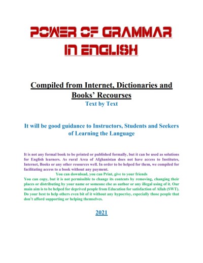 Power of English is a kind of helper for intermediate and Advance learners to repeat their learned points of Grammar in English Language for absorbing to their mind. Not to be forgotten, this book is only additional informal tool which is compiled from various sources for helping to compiler' English study and other learners, and this may be the reason that author is unknown.