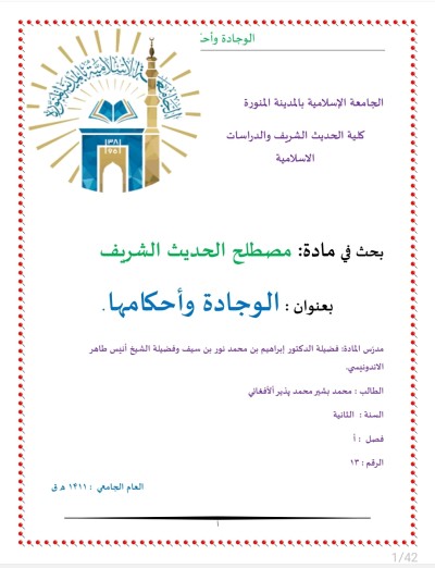 الحمد لله الذي وفقني لكتابة هذا البحث حول «الوجادة وأحكامها»، وهو موضوع دقيق يتعلق بنقل العلم من الكتب من غير سماع أو إجازة، وقد اخترته لما فيه من تساهل عند بعض الرواة في استخدام ألفاظ كـ "عن" أو "حدثنا" عند النقل من الكتب، مما يستوجب الدراسة والبيان.